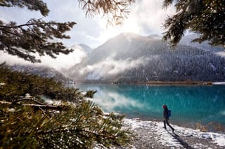 Spend some leisure time here looking at the scenic mountains surrounding the frozen lake.