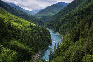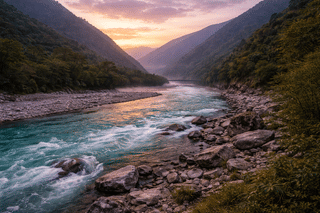 Walk towards the Dibang River which is incredibly clear and flows through a wide valley framed by forests and steep mountain ridges.