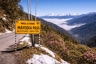 The route climbs up to Mayudia Pass, a high-altitude road with wide views of the Eastern Himalayan mountains and deep river valleys.