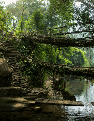 Then the Double Decker Living Root Bridge appears, a living marvel of ancient Khasi bio-engineering.