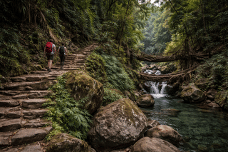 Begin the 3,500-step descent into the Nongriat Jungle, crossing narrow steel suspension bridges that sway over turquoise river pools.